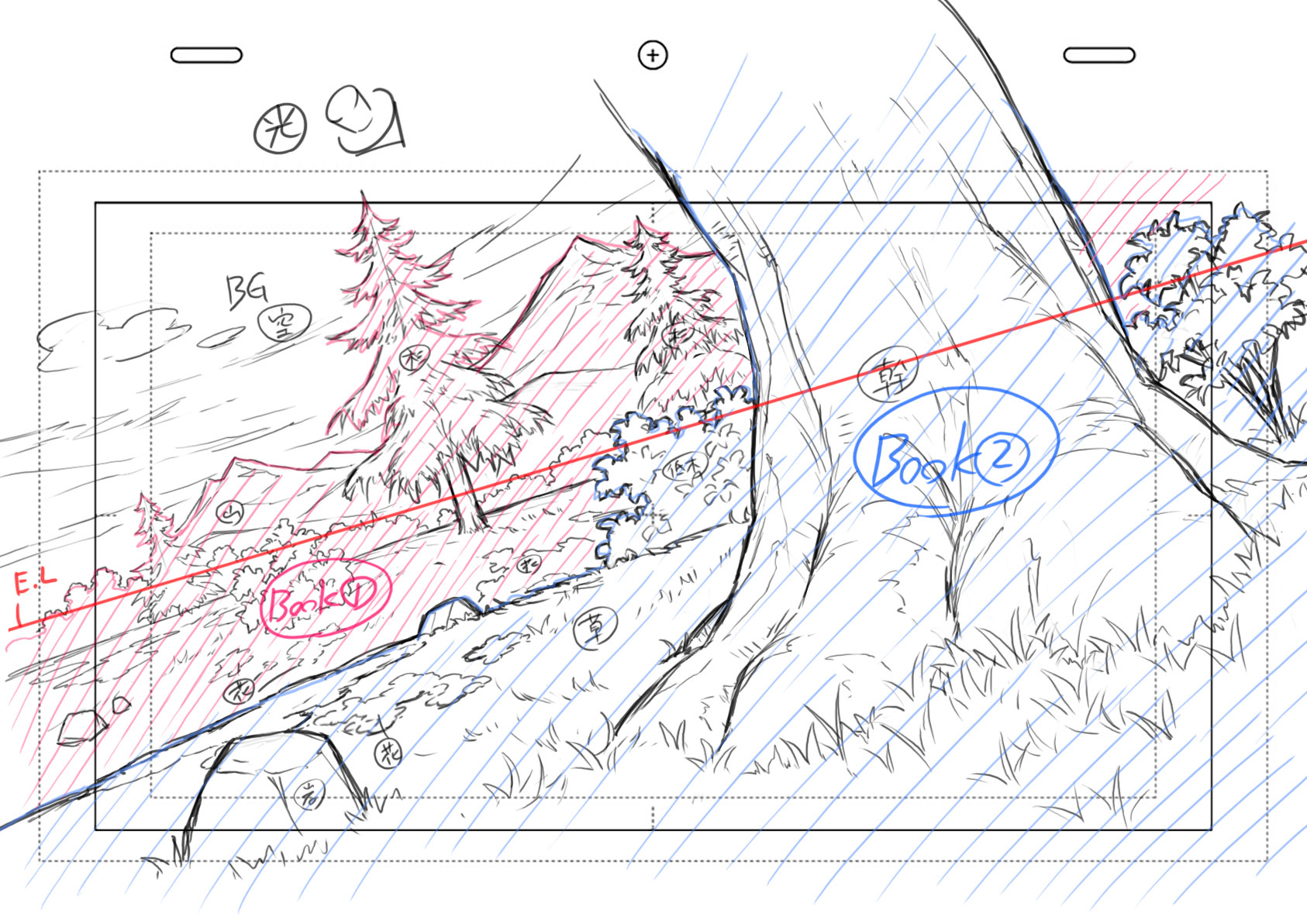 作品の企画段階において、美術設定は監督と綿密な打ち合わせを行い、作品世界の美術コンセプトを決定します。時代設定、地域性、文化背景などを考慮しながら、部屋の間取り、建物のデザイン、重要な小道具の配置など、空間の構造を決定する設計図となる線画を作成します。キャラクターがその中で生活することを想定し、矛盾のない論理的な空間を設計する必要があります。
