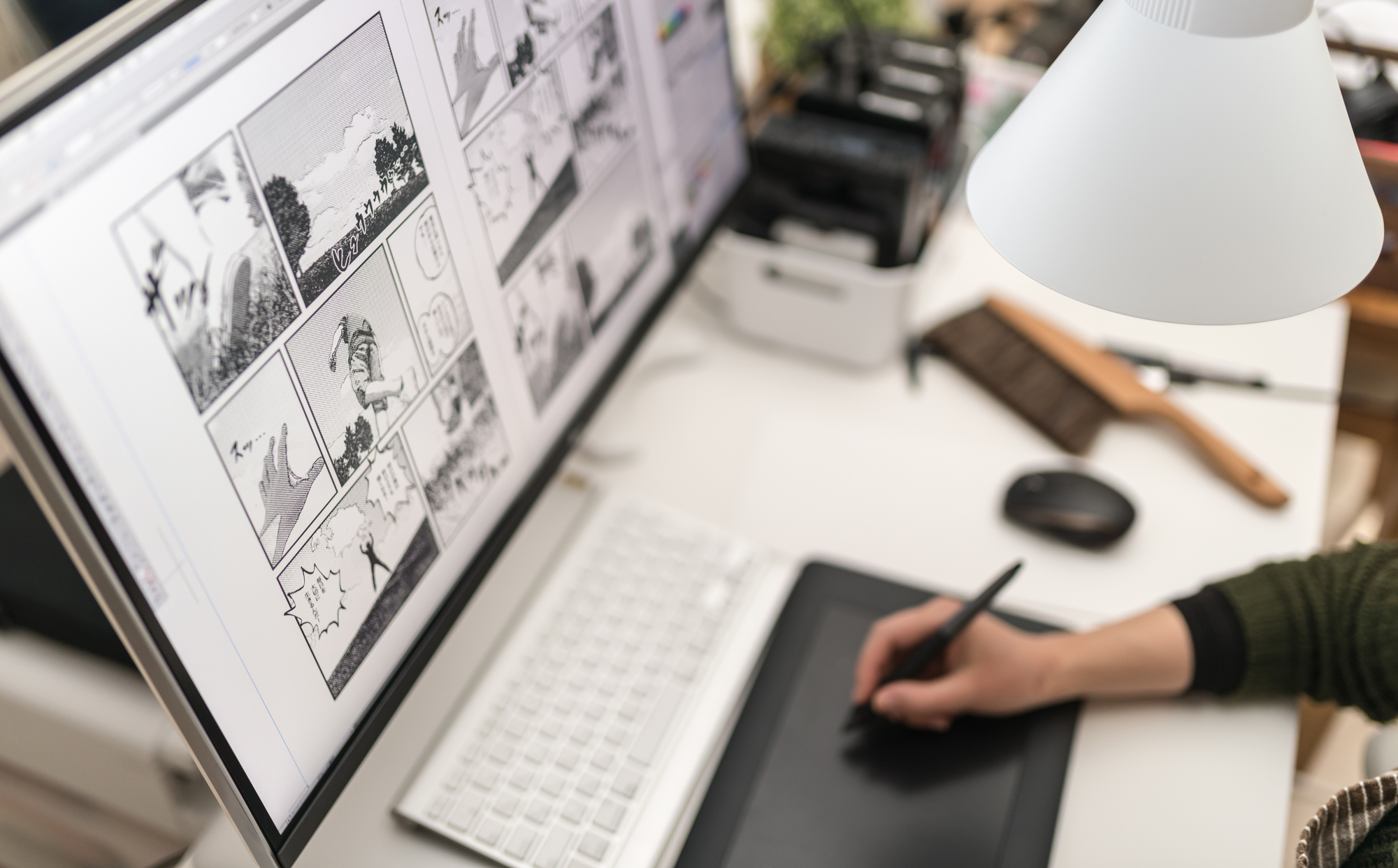 CLIP STUDIO PAINTなどのデジタルツールが業界標準となっており、制作の効率化や修正の容易さといった点で大きな利点をもたらします。Webtoon作品制作など、デジタルならではの表現方法も求められており、液晶タブレットを使った作画技術も重要なスキルとなっています。