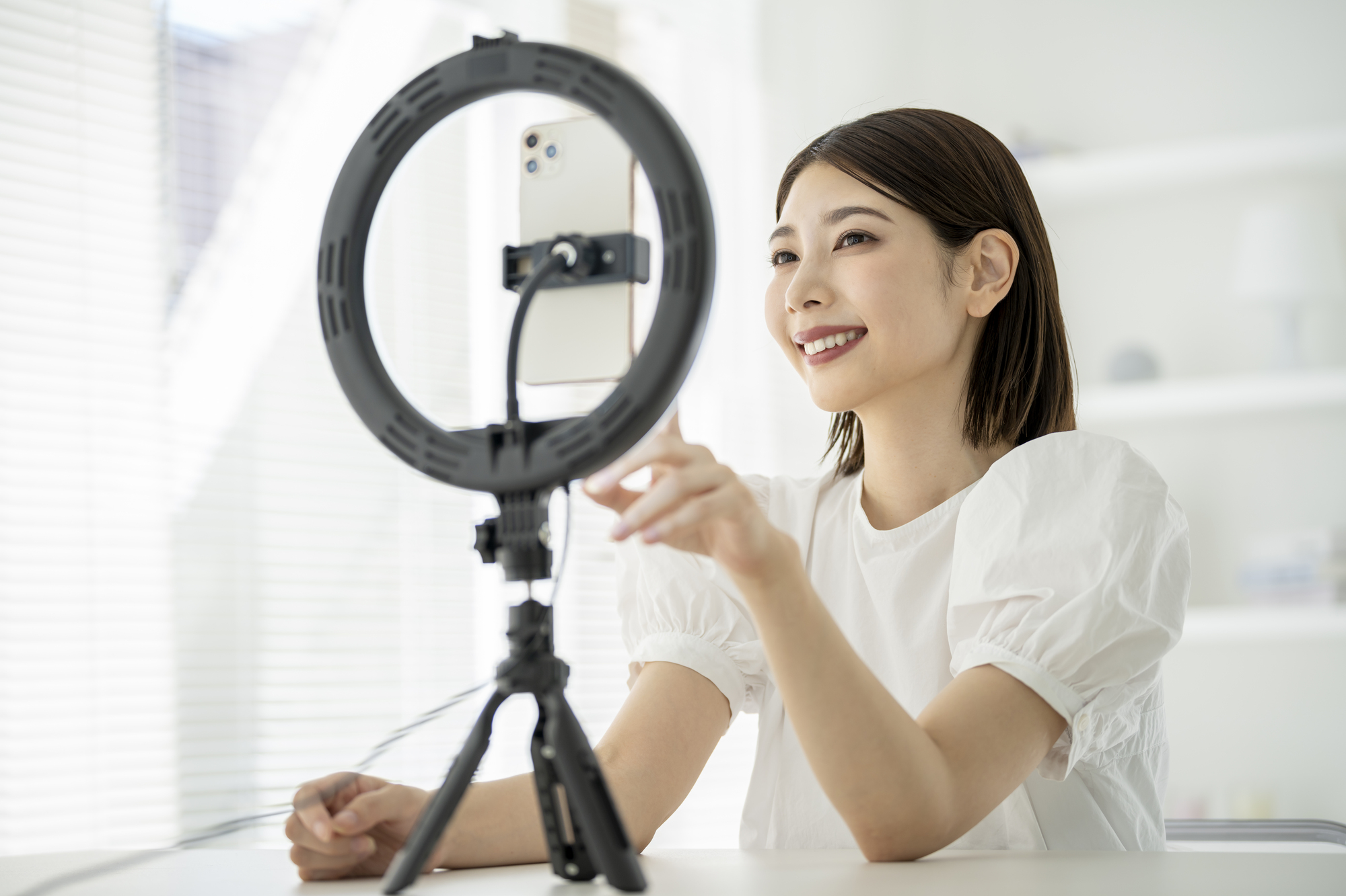 スマートフォン一台あれば始められますが、快適な配信のためにはスマホスタンドとリングライトがあると良いでしょう。本格的にはPC、マイク、Webカメラが推奨されます。