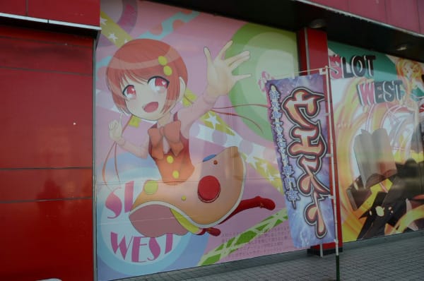 実はこの写真、名古屋地元のパチンコ店「SLOT WEST」の企画で「パチンコ屋の壁を萌え絵で飾ろう」というもの。