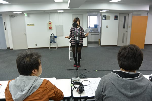 アニメ音響科の学生が、どのように演じて欲しいか指示をし、それに合わせて声優タレント科の学生も何役かのキャラクターをその場で演じます。