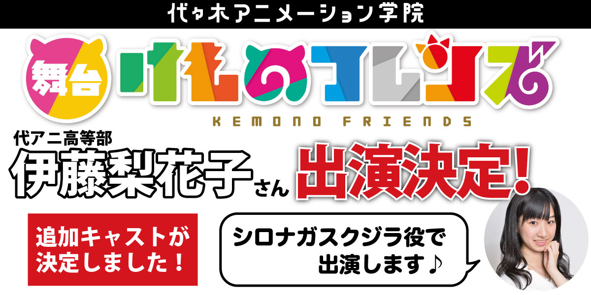 大人気アニメ「けものフレンズ」の、アニメとは違うオリジナルストーリーで綴られる舞台「けものフレンズ」にて、代々木アニメーション学院高等部在学生『伊藤梨花子』さんが出演することが決定いたしました。