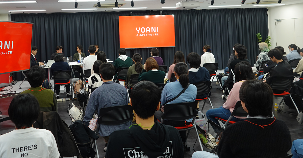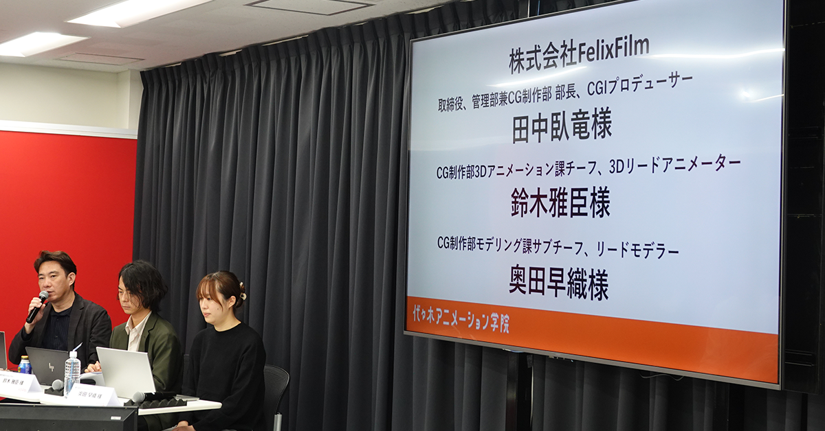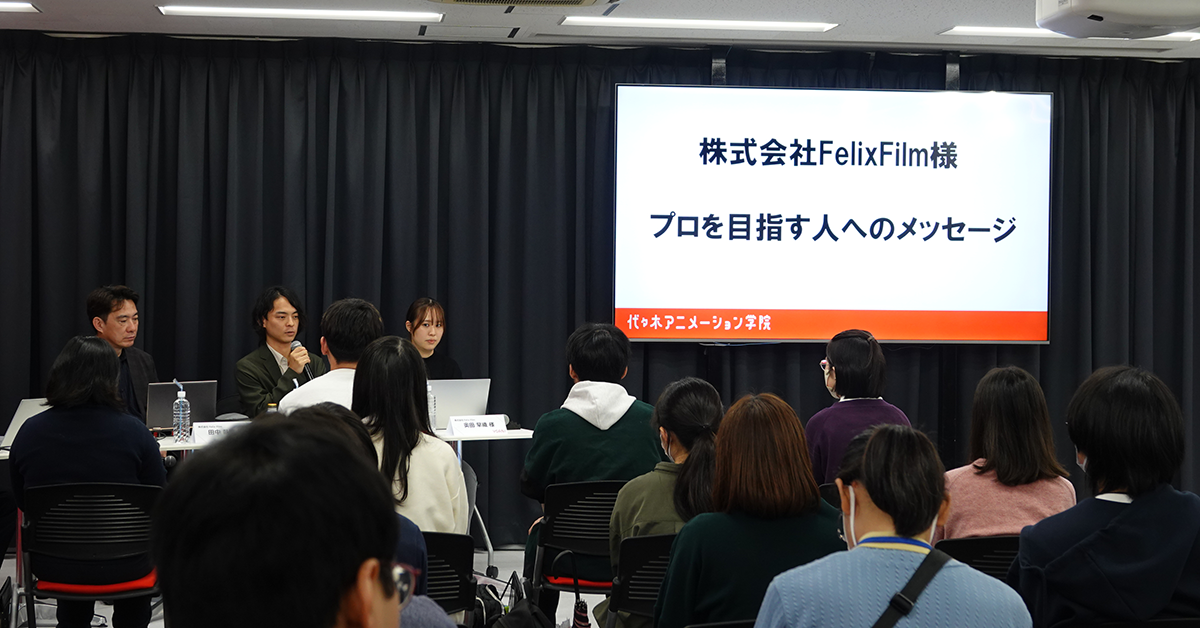 2025年10月25日、代々木アニメーション学院東京校で開催されたオープンキャンパスでは、3DCGアニメ制作会社・株式会社Felix Film様をゲストに迎えてトークイベントを実施しました。
