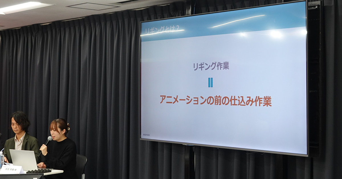 続いて、奥田さんと鈴木さんに実際のCGの制作工程を説明していただきました。CG制作は「モデリング」「リギング」「アニメーション」「コンポジット」の4工程に分かれています。