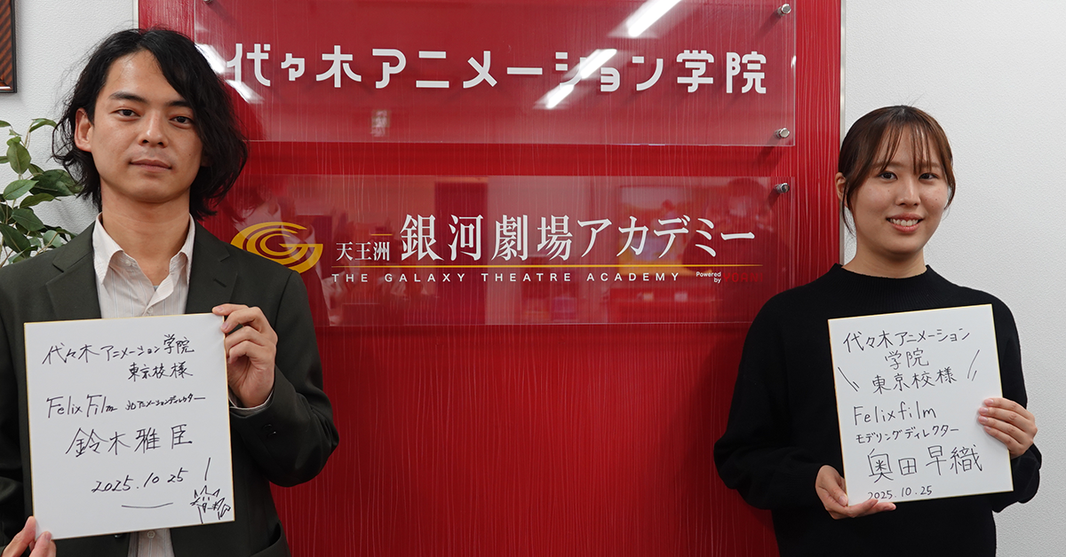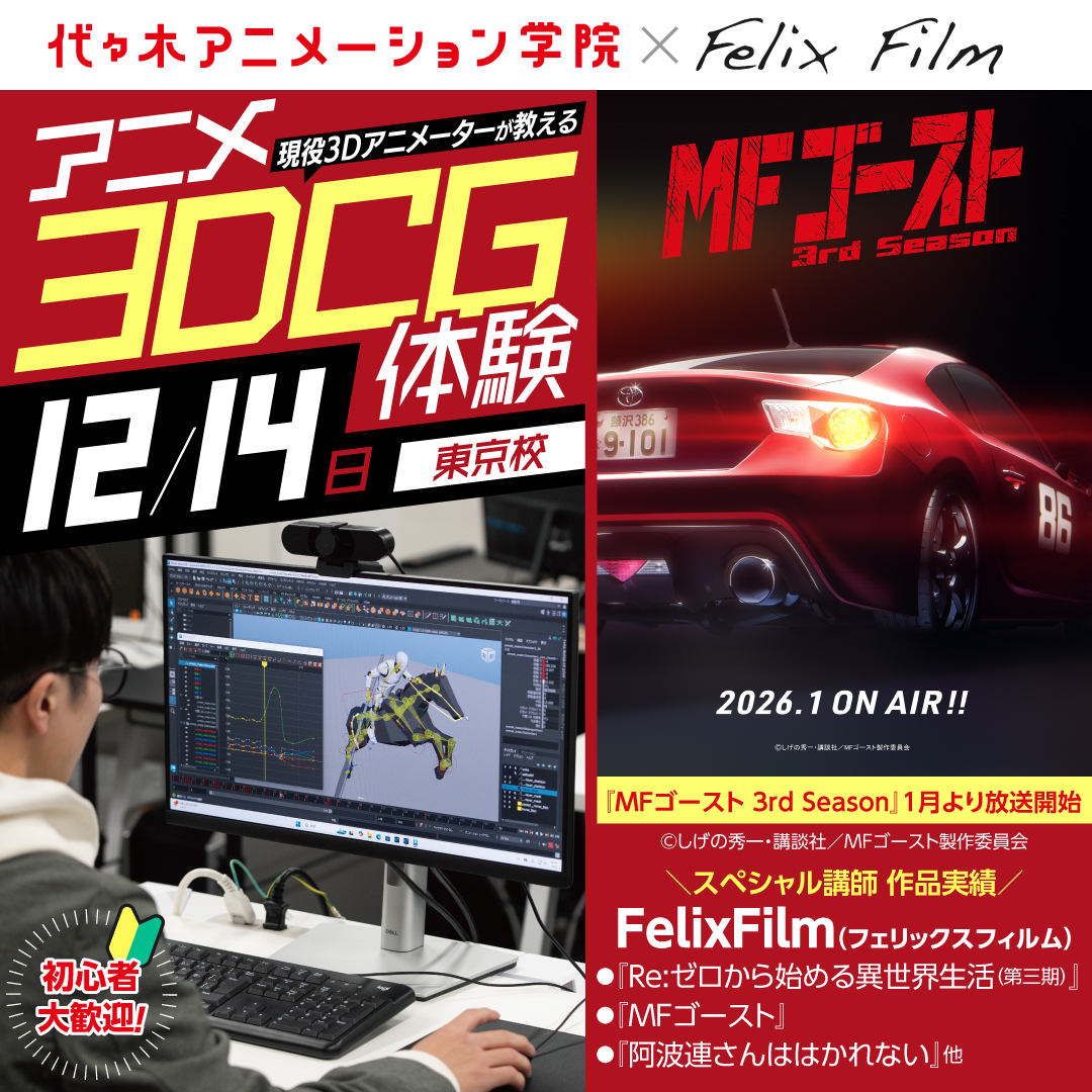Felix Film様と代々木アニメーション学院は、2025年9月に業務提携しています。需要が高まっている3DCGアニメーターの育成のため、カリキュラム監修や特別講義などで協力していきます!