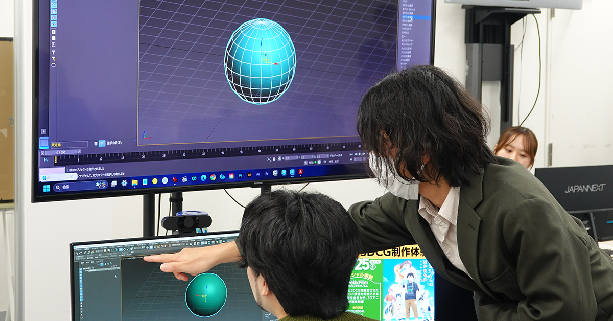 参加者のみなさん初めての体験でしたが、奥田さんが3DCG制作ソフト「3ds MAX」の使い方をイチから丁寧に説明してくれたので、スムーズに制作できていました。