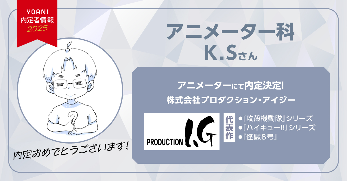 A.私は業界をめざすと決めた時は一般企業で働いていたので、周囲の人に「非現実的だ」と言われたこともありました。ですがこうして第一志望の企業様から内定をいただくことができました。今アニメ業界に入ろうか悩んでいる方は、ぜひ一歩を踏み出してみてほしいです。何歳でも遅すぎることはありません。一緒に頑張りましょう。応援しています!