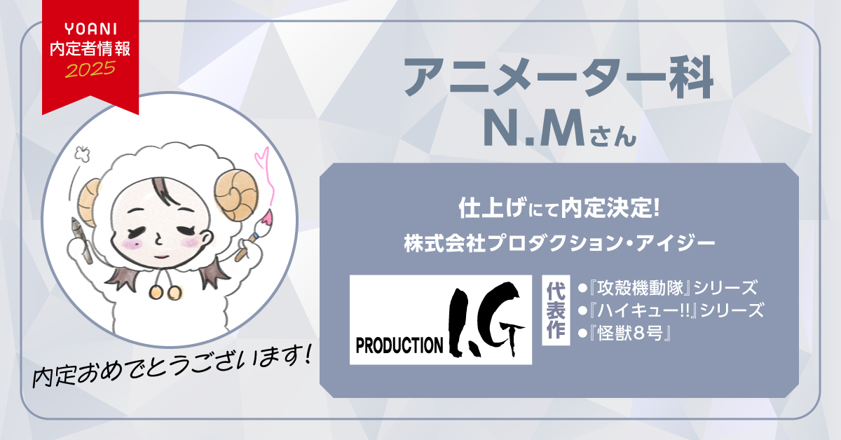 A.TVアニメだけでなく、劇場作品やMVなどのショートフィルム作品まで幅広く手掛けている点に魅力を感じていたからです。 何より、アニメ業界をめざしはじめた当初から好きな会社ですので、内定が決まった時点で辞退する理由はありませんでした。